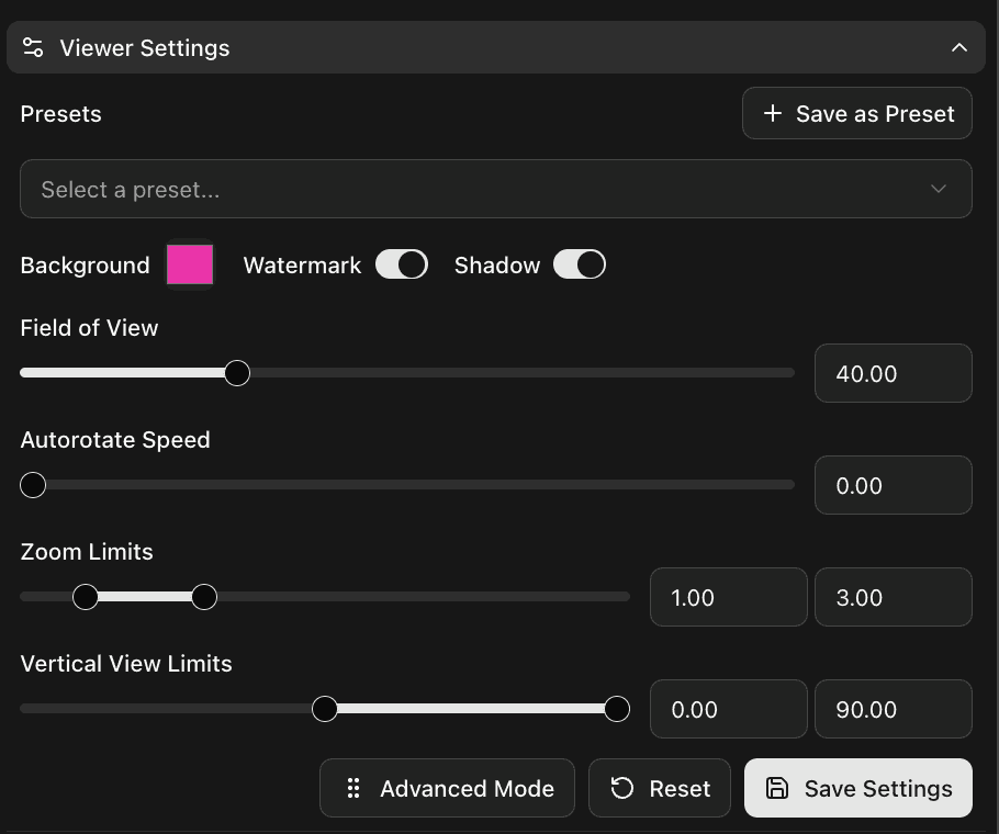 Change the viewing angle, depth of zoom, rotation speed and even limit which angles the user can see. Save as presets.